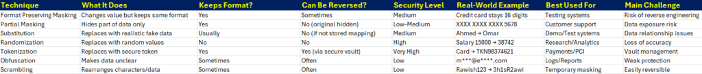 - FPM – Format Preserving Masking: Format Preserving Masking means changing the data but keeping the same structure and pattern. The data looks real and keeps the same length and format, so systems continue working without errors. For example, a credit card number like 4532 9876 1234 5678 may become 8271 4421 9988 3301. It is still 16 digits and still looks like a credit card number, but it is not the real one. Banks and airlines use this method in testing environments where developers need realistic data but must not use real customer information. The challenge is that if the masking method is weak, someone may reverse-engineer it.