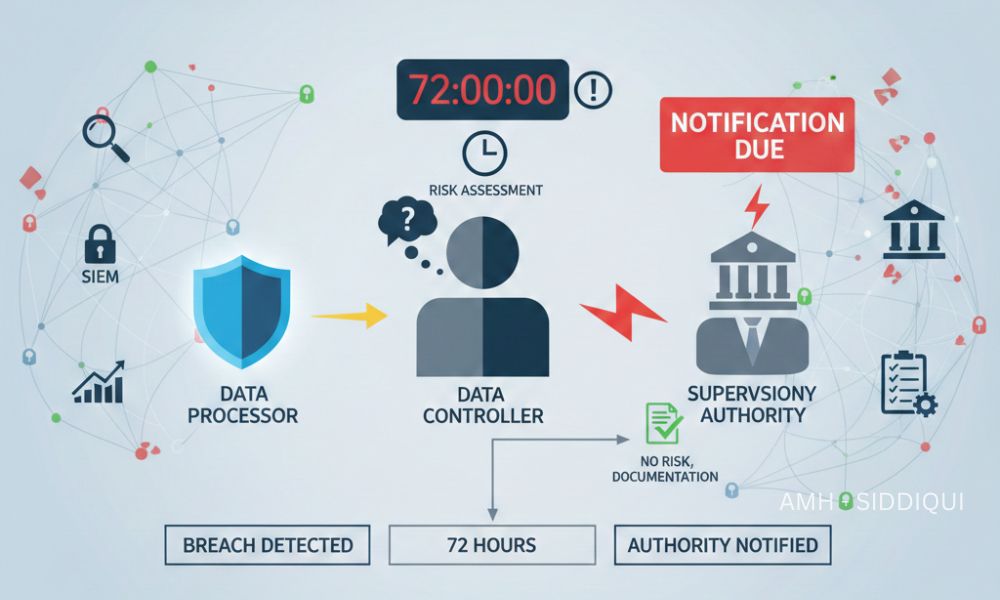 4. Processor Incident: A third-party payroll provider suffers a breach. The processor must immediately notify the controller, who then evaluates reporting obligations.