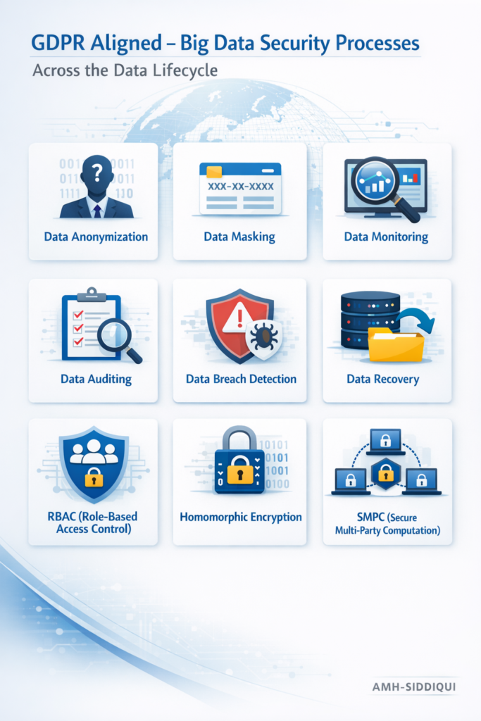 Homomorphic Encryption: Big Data analytics often requires processing sensitive datasets. Homomorphic encryption allows computations on encrypted data without revealing underlying information, maintaining GDPR compliance (Articles 5(1)(f) & 32). For example, a financial analytics platform can calculate risk scores on encrypted customer portfolios without ever decrypting the data. Secure key management, access logging, and secure computation protocols further protect sensitive analytics in large-scale processing pipelines.