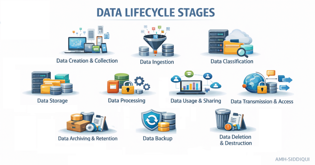 Data Creation & Collection: Data is first generated by users, applications, or digital systems and then collected from multiple sources. For example, when a user registers on an online platform, personal details such as name, email, and contact information are created and collected. In big data environments, this process produces massive volumes of information at high speed. From a privacy perspective, only necessary and relevant data should be created and collected, in line with the principle of data minimization and ensuring transparency, informed consent, and compliance with legal and ethical guidelines.